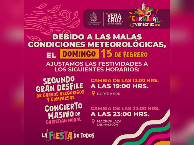El Ayuntamiento de Veracruz informa que el desfile del Carnaval 2026 programado para las 12:00 horas de este domingo 15 de febrero, se recorrerá a las 19:00 horas, mientras que el concierto de Christian Nodal se realizará a las 23:00 horas.