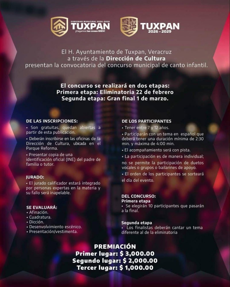 La convocatoria está dirigida a todas las niñas y niños de Tuxpan que tengan gusto por el canto y deseen demostrar su talento ante el público. La primera fase del concurso se llevará a cabo este domingo 22 de febrero a las 18:30 horas, en el Parque Reforma, un espacio emblemático que será el escenario para esta celebración musical.