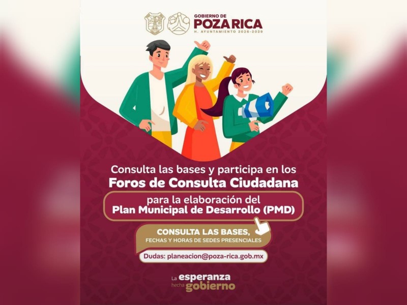 Con el objetivo de fortalecer la participación social y construir un gobierno cercano, incluyente y transparente, el Gobierno de Poza Rica dio a conocer la convocatoria para participar en los Foros de Consulta Ciudadana rumbo a la elaboración del Plan Municipal de Desarrollo (PMD) 2026–2029.