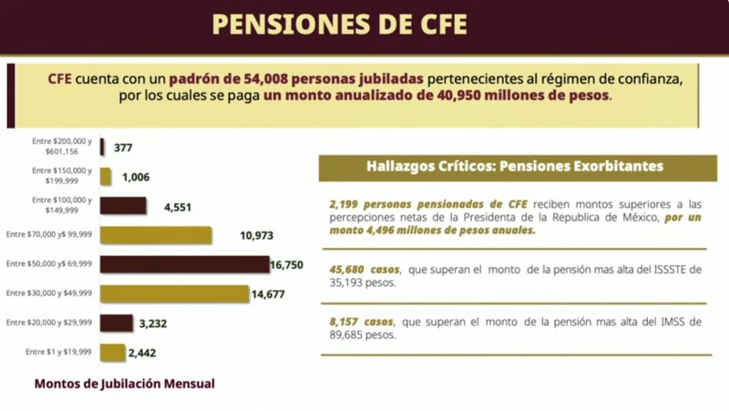La funcionaria destacó el caso de los jubilados de Luz y Fuerza del Centro, quienes reciben un subsidio parcial en el Impuesto Sobre la Renta (ISR), lo que le cuesta al erario aproximadamente 2 mil 400 millones de pesos al año. Esta cifra, señaló, representa una carga injustificada y desproporcionada en comparación con el resto de los trabajadores que se encuentran en proceso de jubilación en el país.