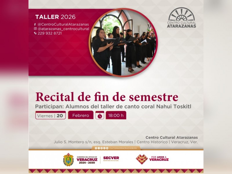La Secretaría de Cultura de Veracruz (SECVER) invita al público a asistir al recital de fin de semestre del Taller de Canto Coral Nahui Toskitl, que se llevará a cabo este viernes 20 de febrero, a las 18:00 horas, en el Centro Cultural Atarazanas. La actividad es gratuita.