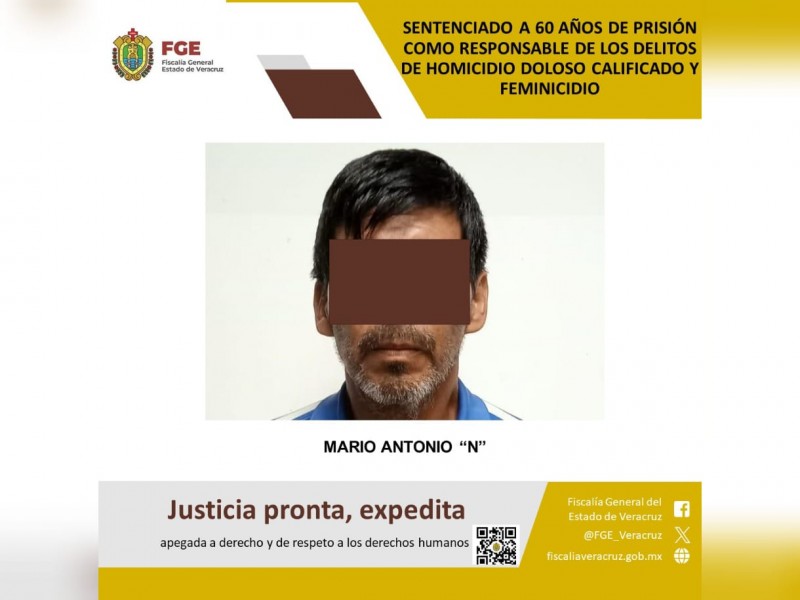 La Fiscalía General del Estado, a través de la Fiscalía Regional Córdoba, dio a conocer que el órgano jurisdiccional dictó una sentencia condenatoria de 60 años de prisión en contra de Mario Antonio “N”, al quedar plenamente acreditada su responsabilidad en los delitos de homicidio doloso calificado y feminicidio, en agravio de dos víctimas cuyas identidades se encuentran legalmente resguardadas.