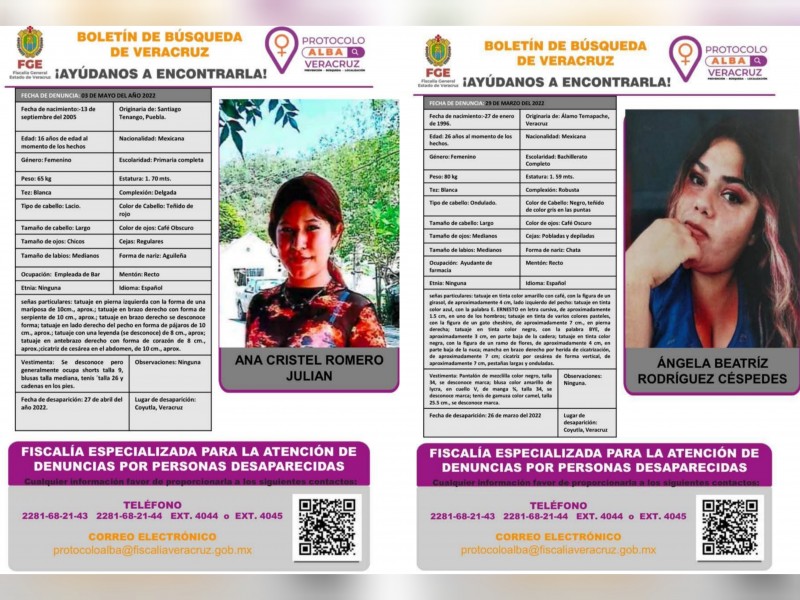 La Fiscalía General del Estado (FGE) activó el Protocolo Alba para la búsqueda de Ana Cristel Romero Julián y Ángela Beatriz Rodríguez Céspedes, quienes fueron reportadas como desaparecidas en este municipio durante marzo y abril de 2022.