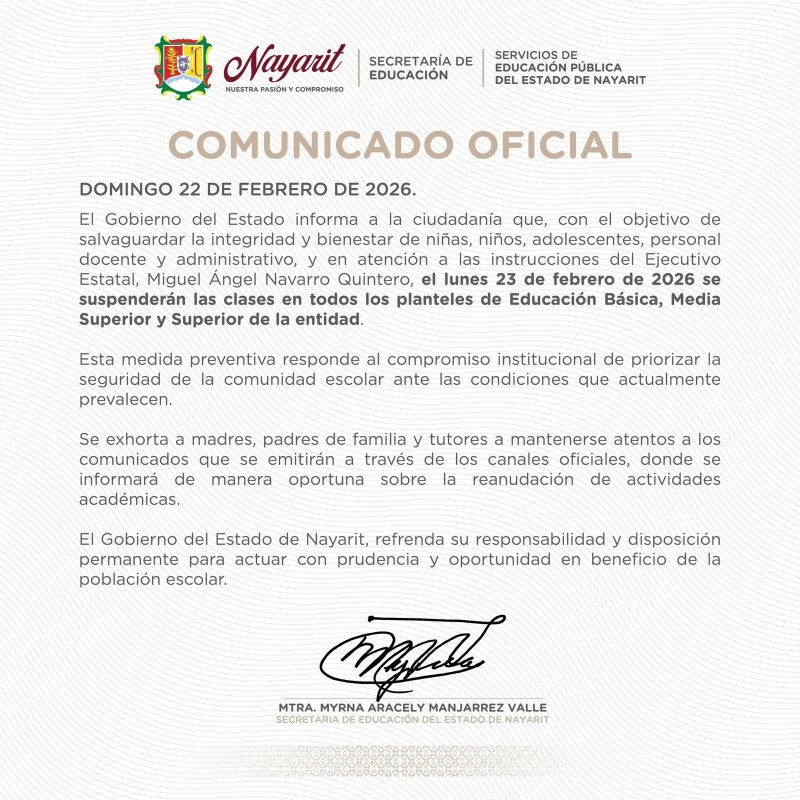 El Gobierno del Estado de Nayarit anunció la suspensión de clases para este lunes 23 de febrero en todos los niveles educativos, como medida preventiva ante las condiciones de seguridad que prevalecen en la región. La decisión fue dada a conocer mediante un comunicado oficial difundido por la Secretaría de Educación estatal, en un contexto marcado por bloqueos carreteros, quema de vehículos y operativos federales registrados en entidades del occidente del país.