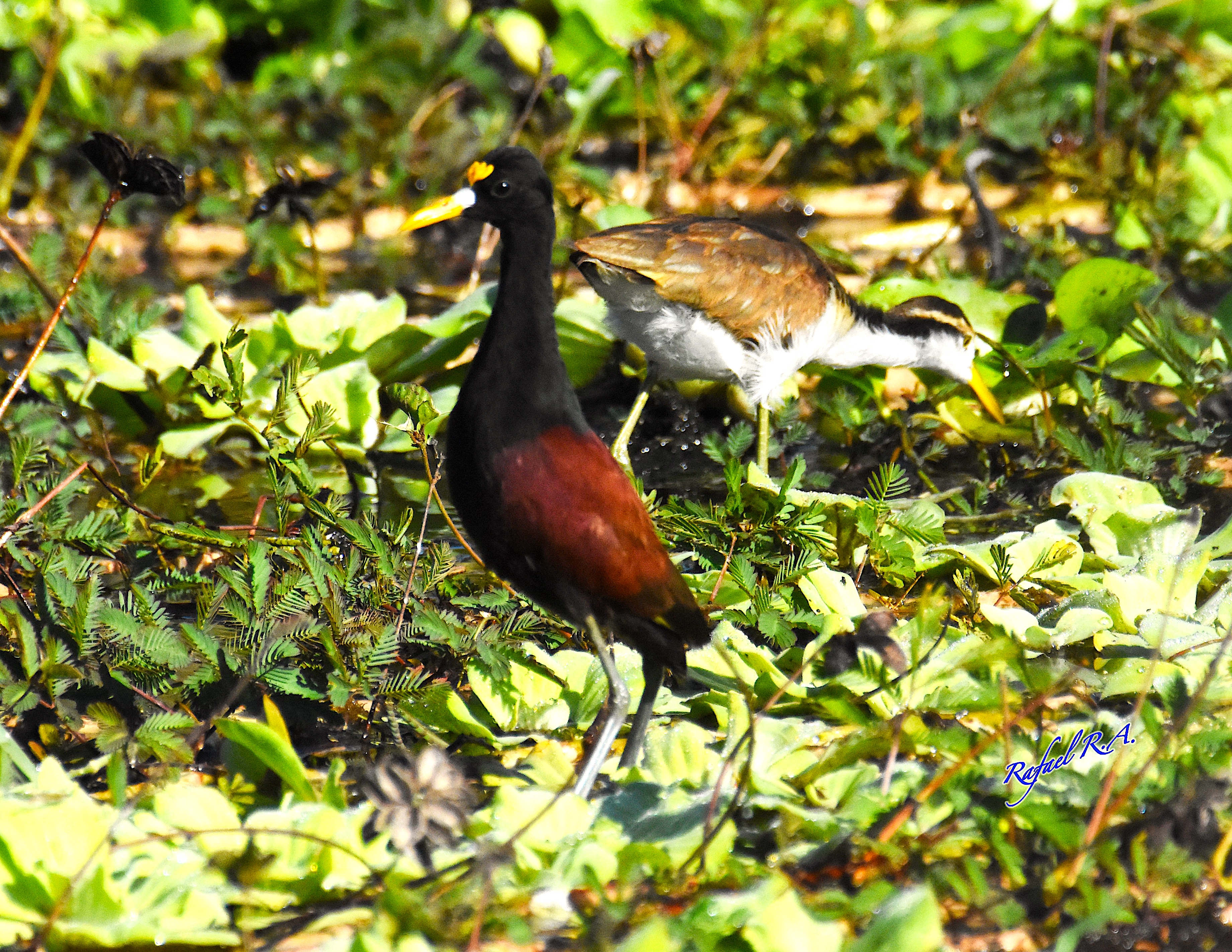Camina con paso muy alzado, tiene dedos muy largos. Es castaño con cabeza y cuello negro, con alas amarillas. Con frente amarilla y pico blanco