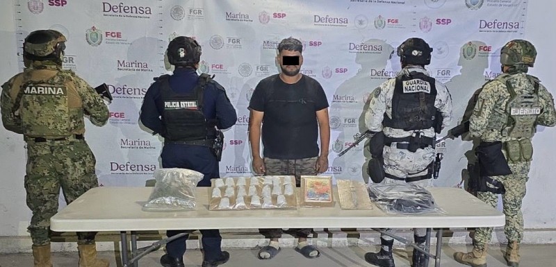 En el municipio de Soconusco las fuerzas del orden aprehendieron a un masculino, presuntamente integrante de un grupo delictivo, decomisándole también 13 dosis de una sustancia con características de cristal.
