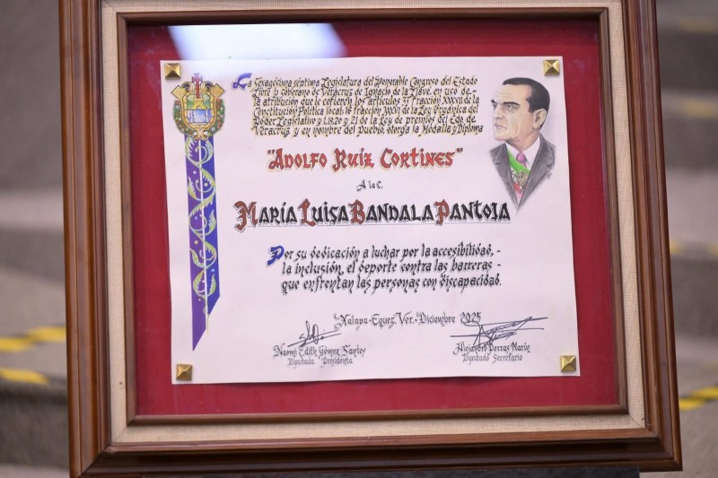 En reconocimiento a su destacada trayectoria en favor de la inclusión, la accesibilidad y el deporte adaptado, la gobernadora Rocío Nahle García entregó, en representación de los tres Poderes del Estado, la Medalla Adolfo Ruiz Cortines 2025 a la ciudadana María Luisa Bandala Pantoja.