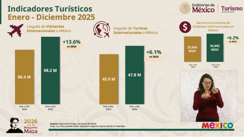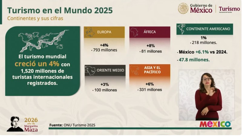 Durante la presentación de los indicadores anuales, la titular de Sectur destacó que mientras el turismo a nivel global creció un 4% (alcanzando los 1,500 millones de viajeros en todo el mundo), México logró despegarse de la media internacional con un avance superior. Este crecimiento del 6% respecto a 2024 coloca al país por encima del promedio del continente americano.