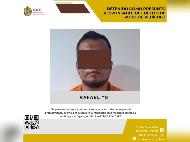 La Fiscalía General del Estado, a través de la Fiscalía de Investigaciones Ministeriales, dio cumplimiento a una orden de aprehensión instruida por un juez de control del Juzgado de Proceso y Procedimiento Penal Oral del Distrito Judicial de Veracruz, en contra de Rafael “N” por su presunta participación en el delito de robo de vehículo en su modalidad de detentación.