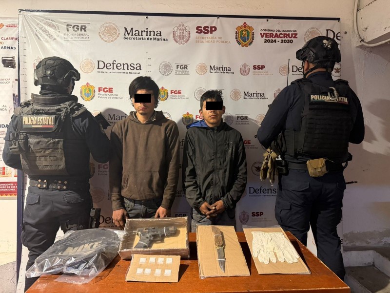 Por el delito de portación ilegal de arma de fuego fueron detenidas tres personas, asegurándoseles tres armas de fuego cortas, una larga y una hechiza, cargadores, cartuchos útiles y un arma blanca; ocho dosis de una sustancia con características del cristal; además de una motocicleta con reporte de robo y una camioneta sin reporte.