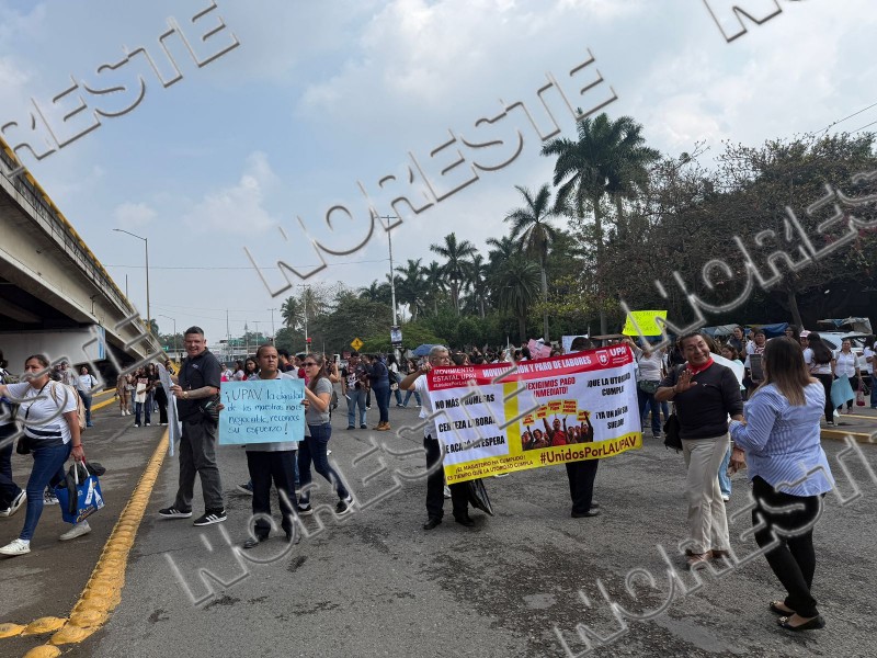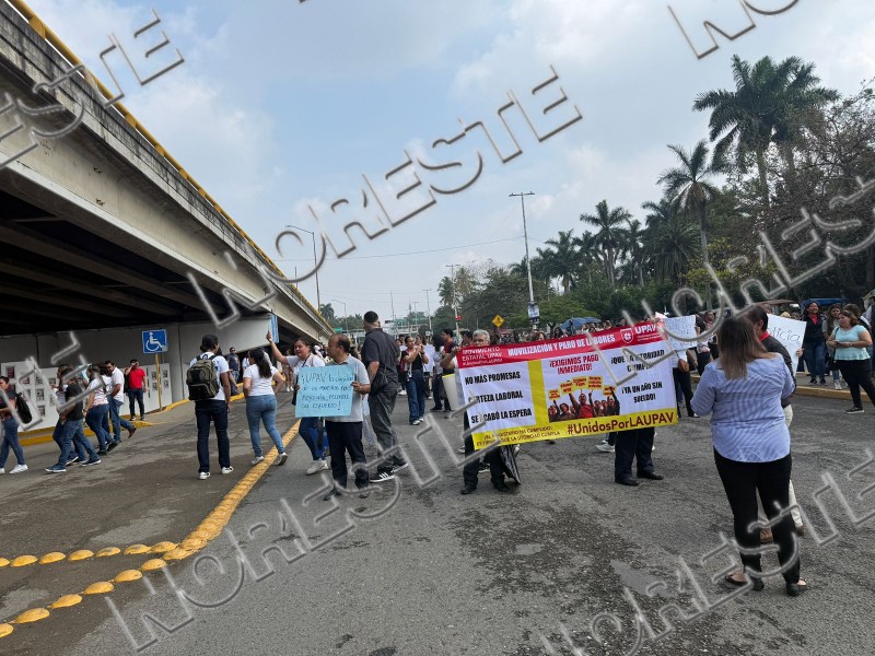 Lo que inició como una asamblea informativa en el Parque Juárez, derivó en un bloqueo total sobre el bulevar Adolfo Ruiz Cortines, donde docentes de la Universidad Popular Autónoma de Veracruz (UPAV) protestaron este sábado para exigir el pago de salarios correspondientes a dos cuatrimestres.