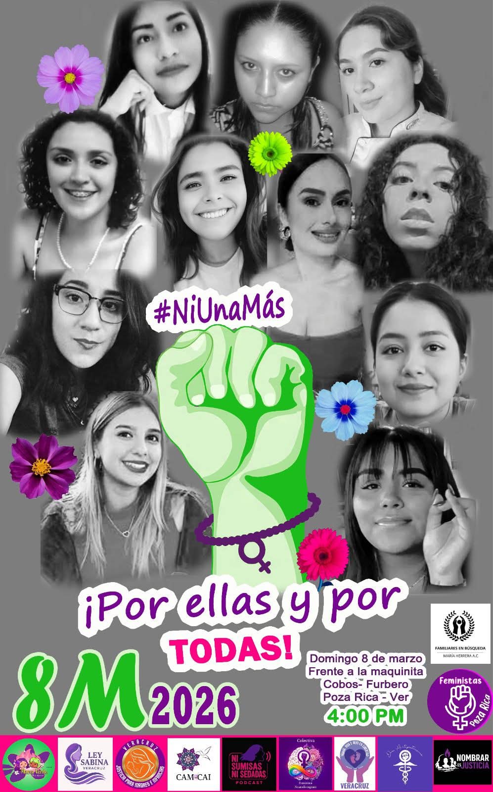 La convocatoria es respaldada por colectivas y organizaciones como Familiares en Búsqueda María Herrera Poza Rica, Marea Verde Totonacapan, Las Brujas del Mar, Ley Sabina, Cam-Cai Colectiva de Amorosas Madres Contra la Violencia Vicaria, Resilencias Veracruzanas, Justicia para Madres e Infancias, Colectiva Feminista Neurodivergente, Olimpia Coral Melo y RadFem Poza Rica, quienes reiteraron que la marcha no tendrá protagonismos individuales y que el objetivo central es alzar una sola voz bajo la consigna: “No estamos todas, nos faltan muchas”.