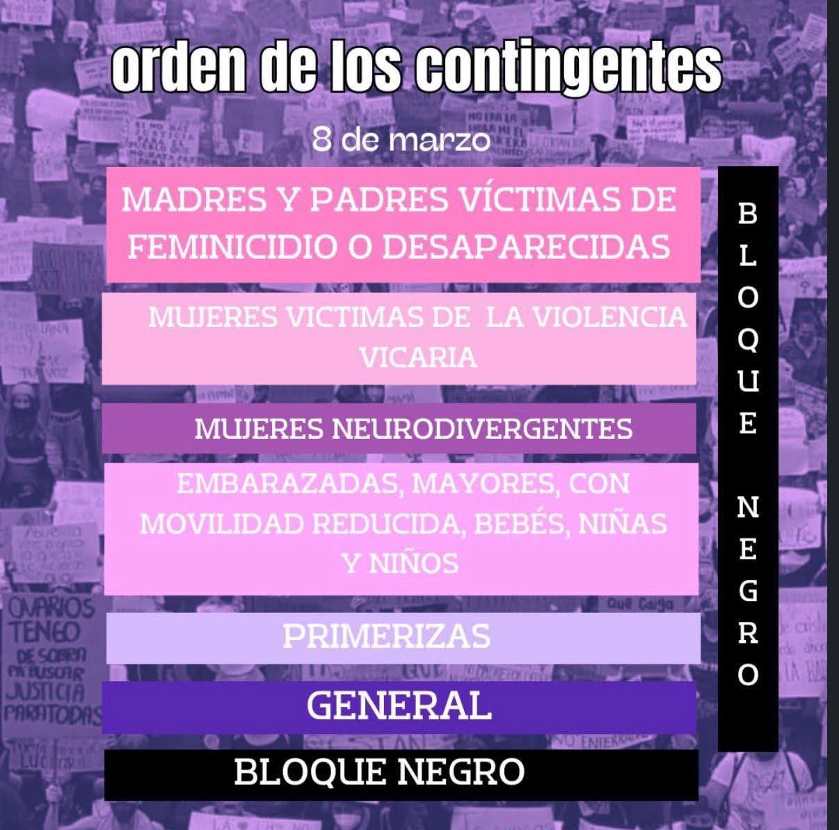 Durante la movilización se dará prioridad en el contingente a madres y padres de víctimas de feminicidio o desaparición; mujeres afectadas por violencia vicaria; mujeres neurodivergentes; embarazadas, adultas mayores y personas con movilidad reducida; primerizas; y posteriormente el bloque general y el llamado “bloque negro”. Aclararon que el orden no representa jerarquía, sino una medida de cuidado y reconocimiento a quienes encabezan la lucha desde el dolor y la resistencia.