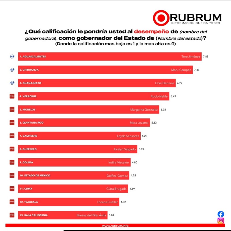 A tres meses de iniciar el 2026, la gestión de Rocío Nahle García en Veracruz mantiene una tendencia ascendente. De acuerdo con la más reciente medición de la casa encuestadora Rubrum, la mandataria veracruzana se ha posicionado en el cuarto lugar nacional entre las mujeres gobernadoras con mejor desempeño administrativo y aceptación ciudadana.