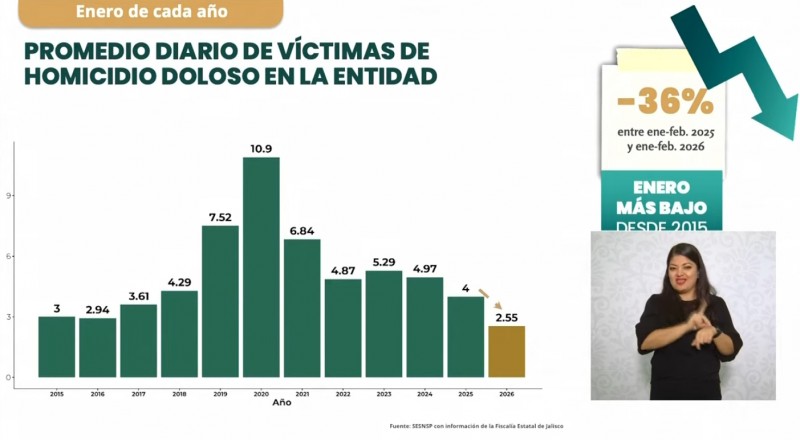 Durante la presentación de resultados en Zapopan, la titular del SESNSP, Marcela Figueroa, calificó las cifras como un hito estadístico. El reporte destaca que el promedio diario de víctimas en la entidad descendió de 4.80 a 2.55, reflejando una tendencia sostenida a la baja.