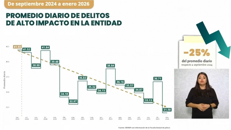 El Secretariado Ejecutivo del Sistema Nacional de Seguridad Pública (SESNSP) reveló este viernes un avance sin precedentes en la agenda de seguridad de Jalisco. De acuerdo con el último informe de incidencia delictiva, el estado registró una reducción del 47% en homicidios dolosos en el periodo comprendido entre septiembre de 2024 y enero de 2026.