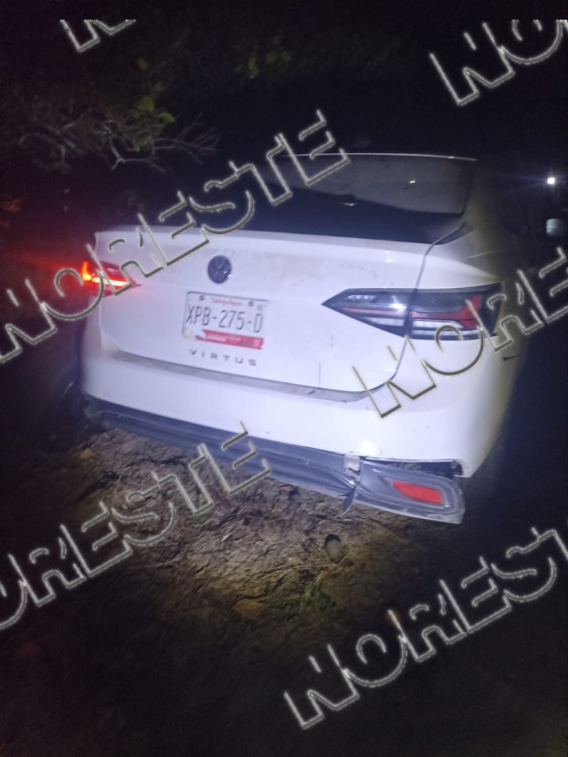 Un automóvil Volkswagen tipo Virtus, color blanco, con placas XPB-275-D del estado de Tamaulipas, se salió de la carretera federal Álamo–Tihuatlán la noche de este viernes y terminó dentro de un naranjal tras caer a una hondonada de aproximadamente tres metros de profundidad.