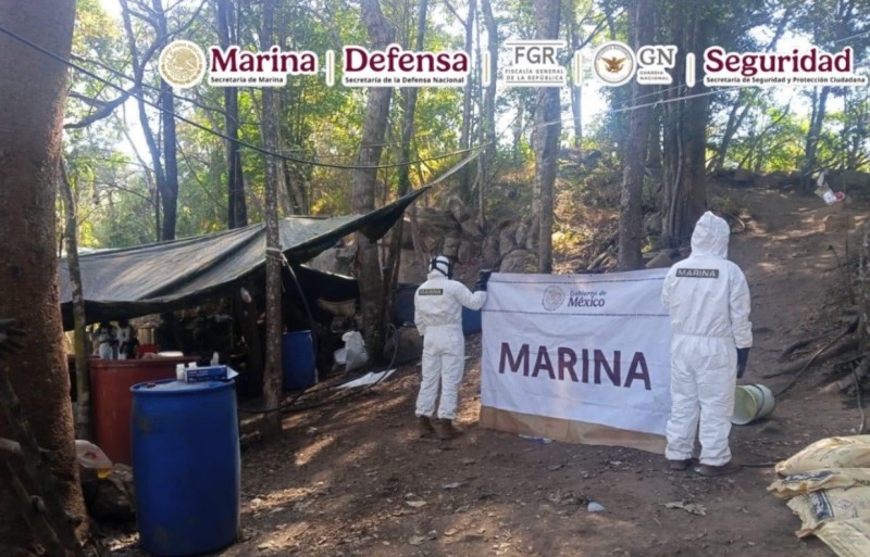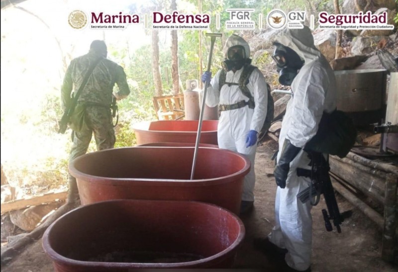 En un comunicado, la Secretaría de Seguridad y Protección Ciudadana (SSPC) informó que en una primera acción, en la localidad La Cuadrilla del citado municipio, se aseguraron aproximadamente 300 kilos de droga sintética, 150 kilos de la misma sustancia en proceso de secado, así como 24 mil litros de precursores químicos y alrededor de 20 mil kilos de sustancias químicas sólidas.