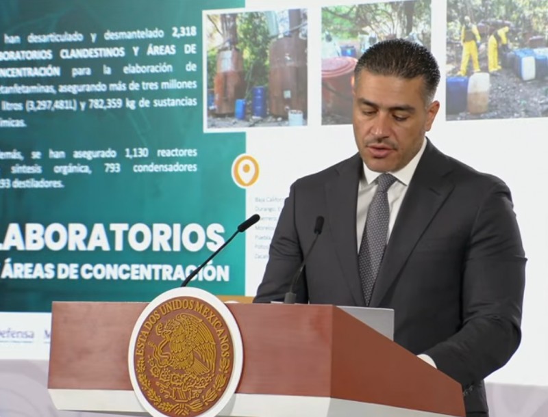 En materia de combate al narcotráfico, el funcionario destacó el decomiso de 346 toneladas de diversas drogas. Gracias a la intervención del Ejército Mexicano y la Marina Armada de México, se desmantelaron 2,318 laboratorios clandestinos destinados a la producción de metanfetaminas.