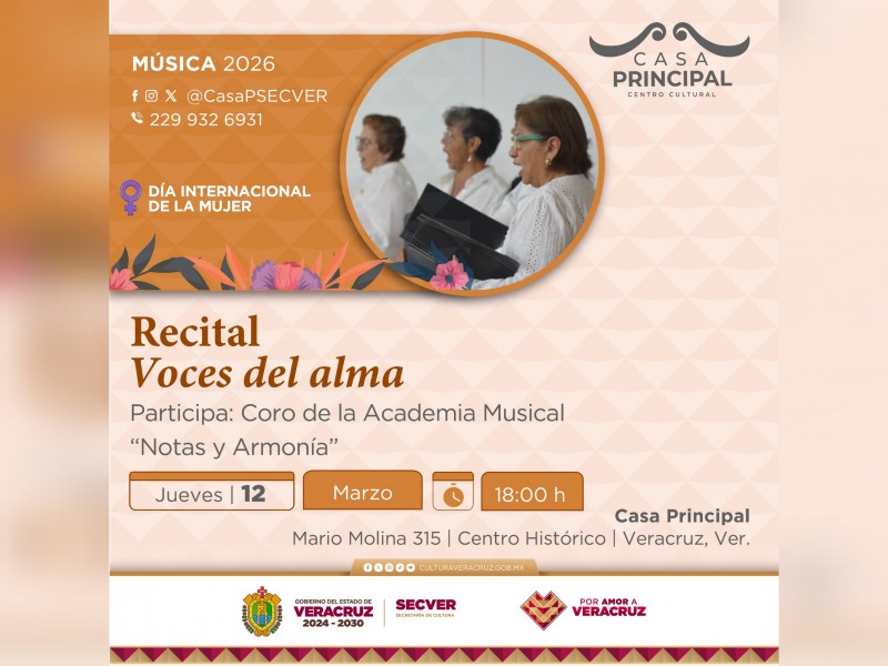 La Secretaría de Cultura de Veracruz (SECVER) invita al público en general al recital del Coro de Mujeres Voces del Alma, que se efectuará este jueves a las 18:00 horas, en el recinto cultural Casa Principal, en Veracruz, en el marco del Día Internacional de la Mujer.