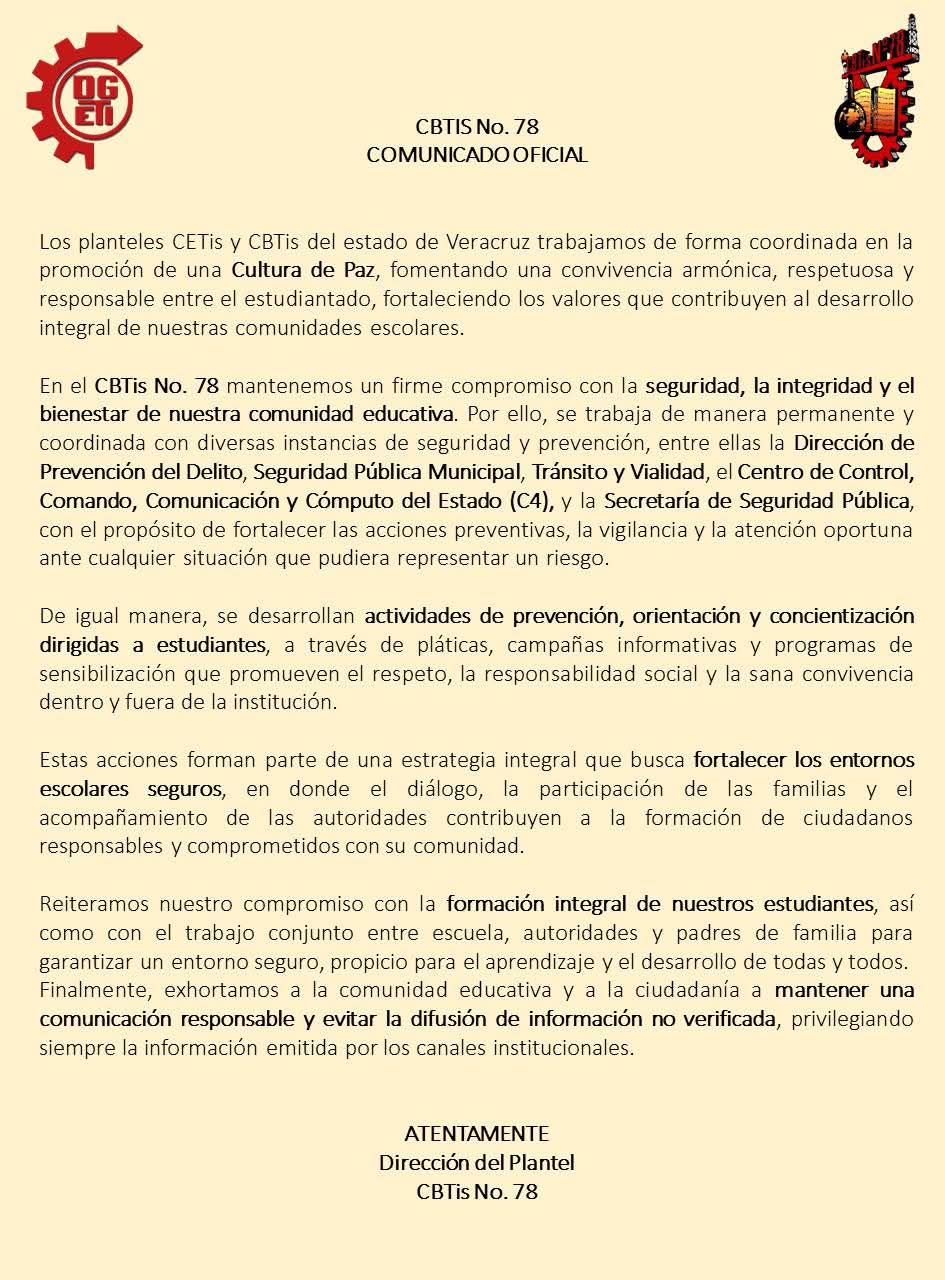 Mediante un comunicado, el plantel explicó que en los centros CETis y CBTis del estado se impulsa de manera constante la formación en valores y la convivencia responsable, con el objetivo de prevenir situaciones que puedan afectar la tranquilidad dentro de los espacios educativos.