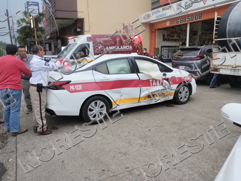 Entre las unidades participantes se encuentra un Chevrolet Aveo de color blanco, un taxi identificado con el número económico PR-1026 y un automóvil Chevrolet rojo de modelo atrasado.
