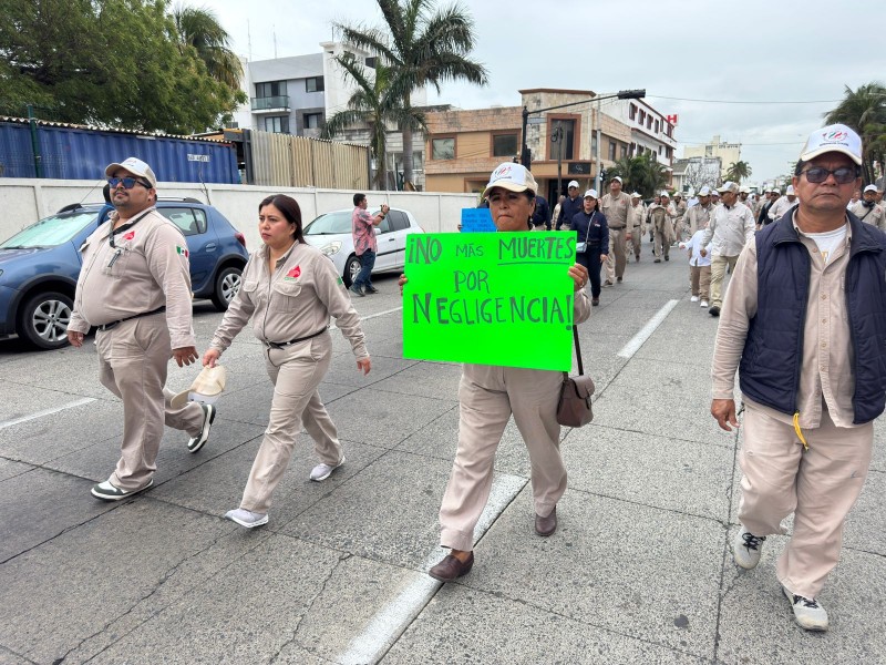 Durante el desfile realizado sobre la avenida Miguel Alemán, a la altura de las oficinas de la Sección 9, empleados petroleros marcharon acompañados de unidades de la empresa y turibuses, mientras portaban cartulinas en las que exigían médicos, medicinas y mejores condiciones de seguridad laboral.
