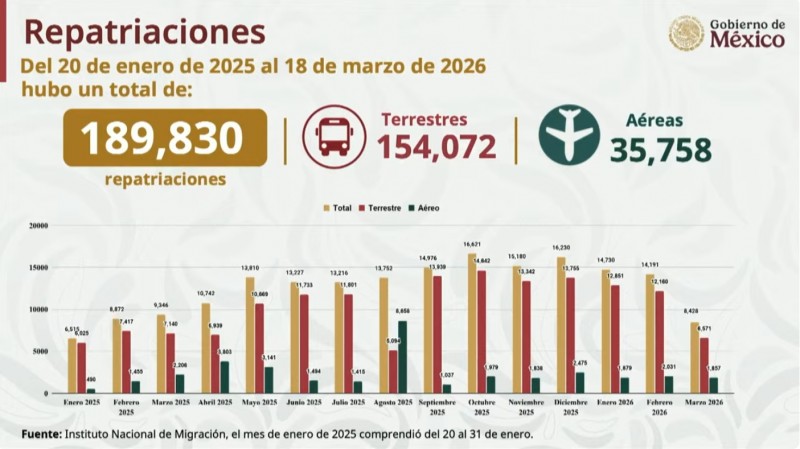 La Secretaría de Gobernación (Segob) presentó un balance detallado de la Estrategia Nacional de Repatriación "México te Abraza", informando que, desde su puesta en marcha en enero de 2025 hasta marzo de 2026, se han registrado 189 mil 830 repatriaciones de ciudadanos mexicanos provenientes de Estados Unidos.