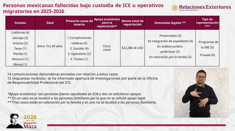 El Gobierno de México, a través de la Secretaría de Relaciones Exteriores (SRE), calificó como "absolutamente doloroso e inaceptable" el fallecimiento de 13 connacionales mientras se encontraban bajo la custodia del Servicio de Inmigración y Control de Aduanas (ICE) o durante operativos de dicha agencia en Estados Unidos.