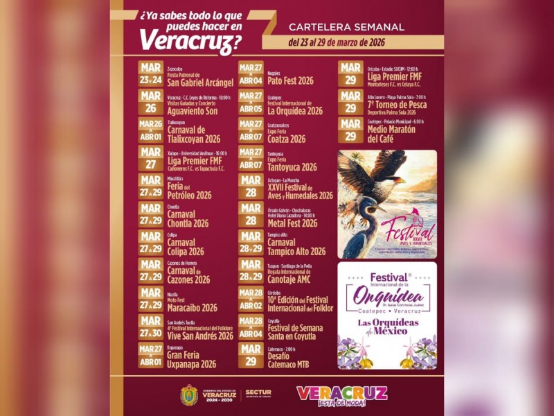 La Secretaría de Turismo (SECTUR) invita a disfrutar de la agenda de actividades que se llevarán a cabo del 26 al 29 de marzo en distintos municipios de Veracruz, con una amplia oferta de eventos culturales, deportivos, gastronómicos y tradicionales.
