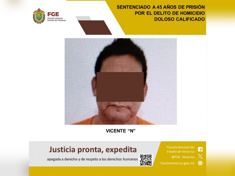 La Fiscalía Regional Veracruz reportó 7 sentencias condenatorias, entre ellas, la dictada en Boca del Río contra Vicente “N”, condenado a 45 años de prisión por el homicidio doloso calificado ocurrido el 6 de agosto de 2023, en la localidad de Pozuelos, municipio de Tlalixcoyan, donde el sentenciado privó de la vida a la víctima con un arma de fuego. En el marco del juicio oral 159/2025, el juez dictó la pena privativa de libertad y la suspensión de sus derechos civiles y políticos.