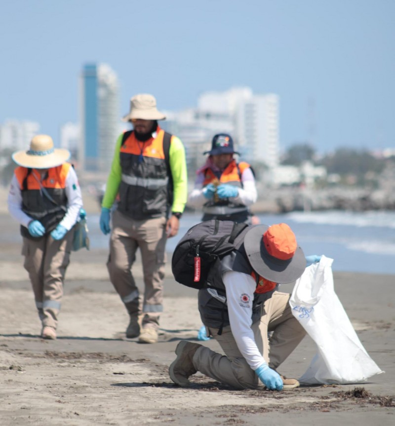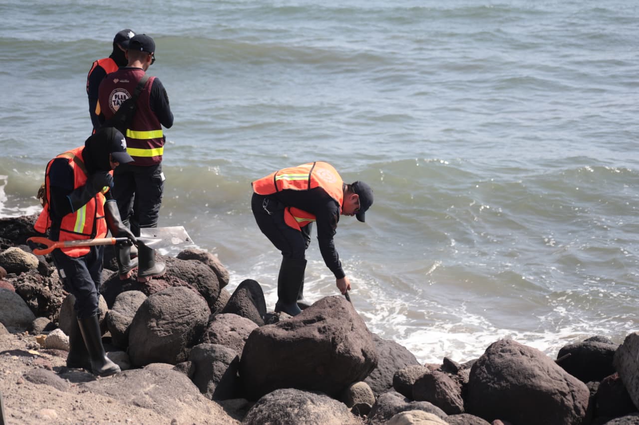 Precisó que se trata de trazas de hidrocarburo presentes en cantidades reducidas, sin acumulaciones mayores, las cuales son retiradas mediante un trabajo minucioso. Las labores se concentran en la zona de rompiente, donde el oleaje deposita los residuos, mismos que son recolectados de forma manual tras un primer barrido municipal.