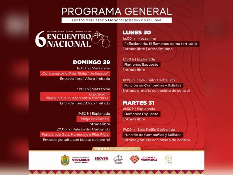 La Secretaría de Cultura de Veracruz (SECVER), en colaboración con Artífice Centro Vocacional y Profesional para la Danza, invita al 6.° Encuentro Nacional de Flamenco, Danza Española y Experimentación, que se llevará a cabo del 29 al 31 de marzo.