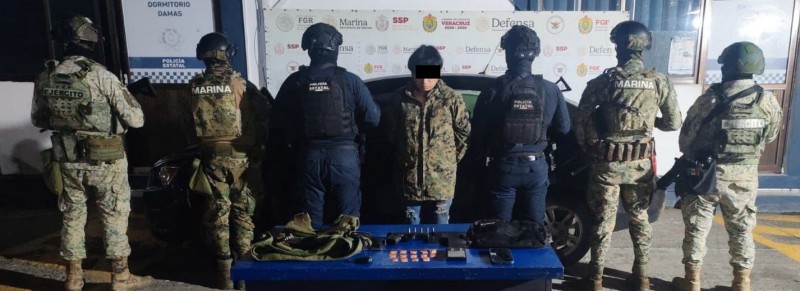 En Tihuatlán fue detenido un masculino por delitos contra las instituciones de seguridad, a quien se le aseguró un arma de fuego corta, cargadores, cartuchos útiles, 14 dosis de una sustancia con características similares al cristal, una báscula, equipo táctico y un vehículo sin reporte de robo.