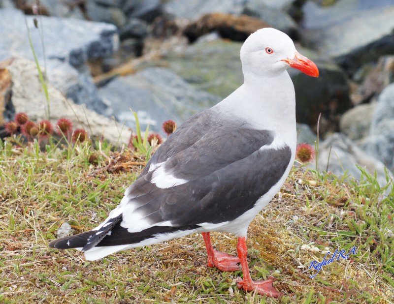 Gaviota austral, o Patagónica. De Adultos de plumaje grisáceo, cabeza, cuello y plumaje ventral blanco, patas y pico naranja. Miden alrrededor de 38 cm y un peso de 540 g.
