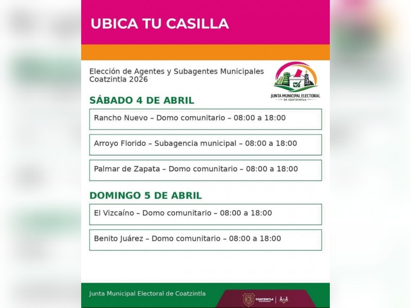 Para facilitar el ejercicio del voto, se han publicado de manera oficial los horarios y sedes correspondientes a cada localidad. La administración local, bajo el distintivo "Coatzintla tiene grandeza", hizo un llamado a mantener el orden y la civilidad durante las jornadas, asegurando que existen las condiciones de seguridad necesarias para que las familias acudan a emitir su sufragio de manera libre y pacífica en sus respectivas demarcaciones.
