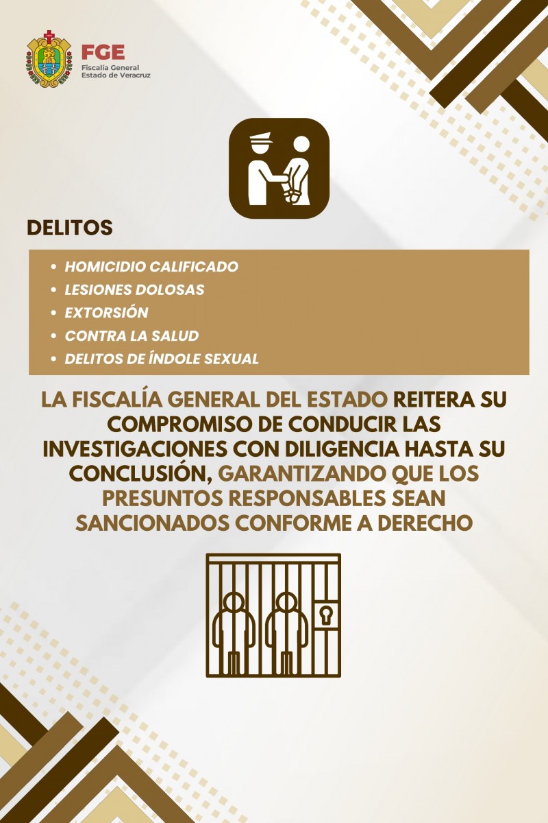 Cabe señalar que, dentro del total de mandamientos ejecutados, se incluyen procesos relacionados con conductas como el homicidio calificado, entre ellos el de Lorenzo “N”, derivado de un cateo en la ciudad de Tierra Blanca, así como la detención de Luis Felipe “N” señalado por hechos ocurridos en el municipio de Ixcatepec, por su presunta responsabilidad en el delito de lesiones dolosas. Asimismo, se contemplan delitos de índole sexual, extorsión y contra la salud, además de otros ilícitos atendidos durante este periodo.