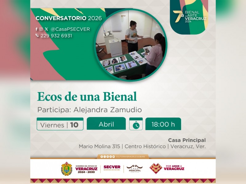 La Secretaría de Cultura de Veracruz (SECVER) invita al público a asistir al conversatorio Ecos de una Bienal, que se llevará a cabo el viernes 10 de abril, a las 18:00 horas, en el Centro Cultural Casa Principal, en Veracruz.