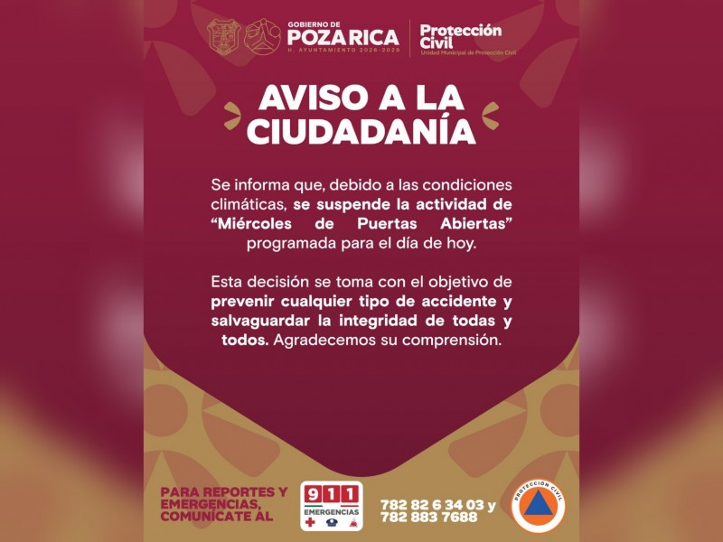 Las condiciones climáticas registradas este día obligaron a la suspensión de la actividad “Miércoles de Puertas Abiertas”, programada para este miércoles, informaron autoridades municipales.
