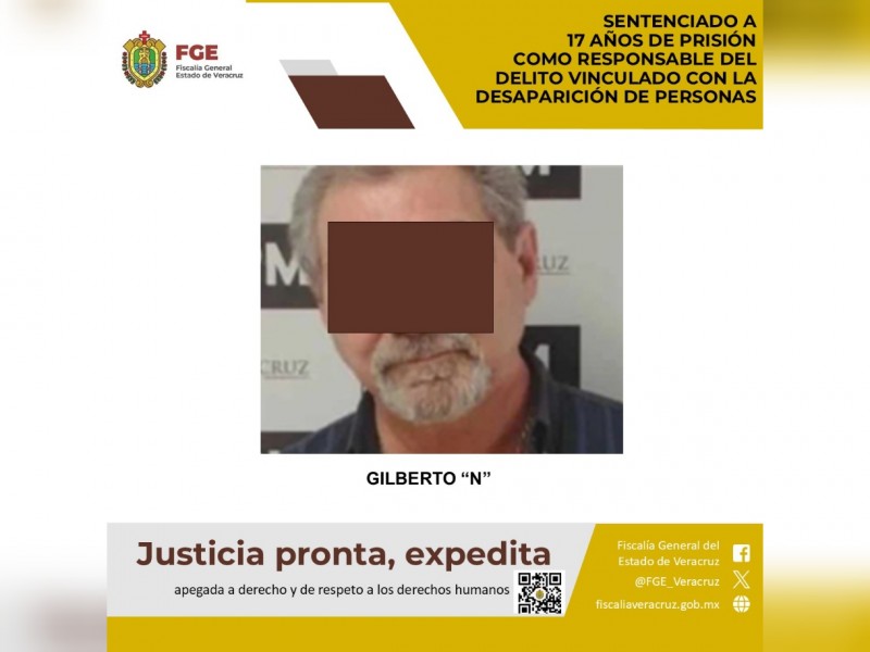 Como resultado de una investigación ministerial sólida y el desahogo de pruebas en el juicio, la Fiscalía General del Estado de Veracruz, logró la sentencia condenatoria de Gilberto “N”, consistente en 17 años de prisión, declarado por el órgano jurisdiccional como responsable del delito vinculado con la desaparición de personas.