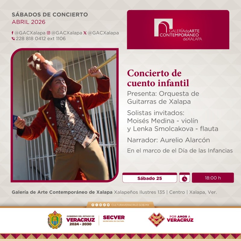 Posteriormente, el 25 de abril, el Concierto de Cuento Infantil a cargo de la Orquesta de Guitarras de Xalapa de la Dirección de Actividades Artísticas de la SEV, en compañía de los intérpretes Moisés Medina y Lenka Smolcakova, con el narrador Aureliano Alarcón.