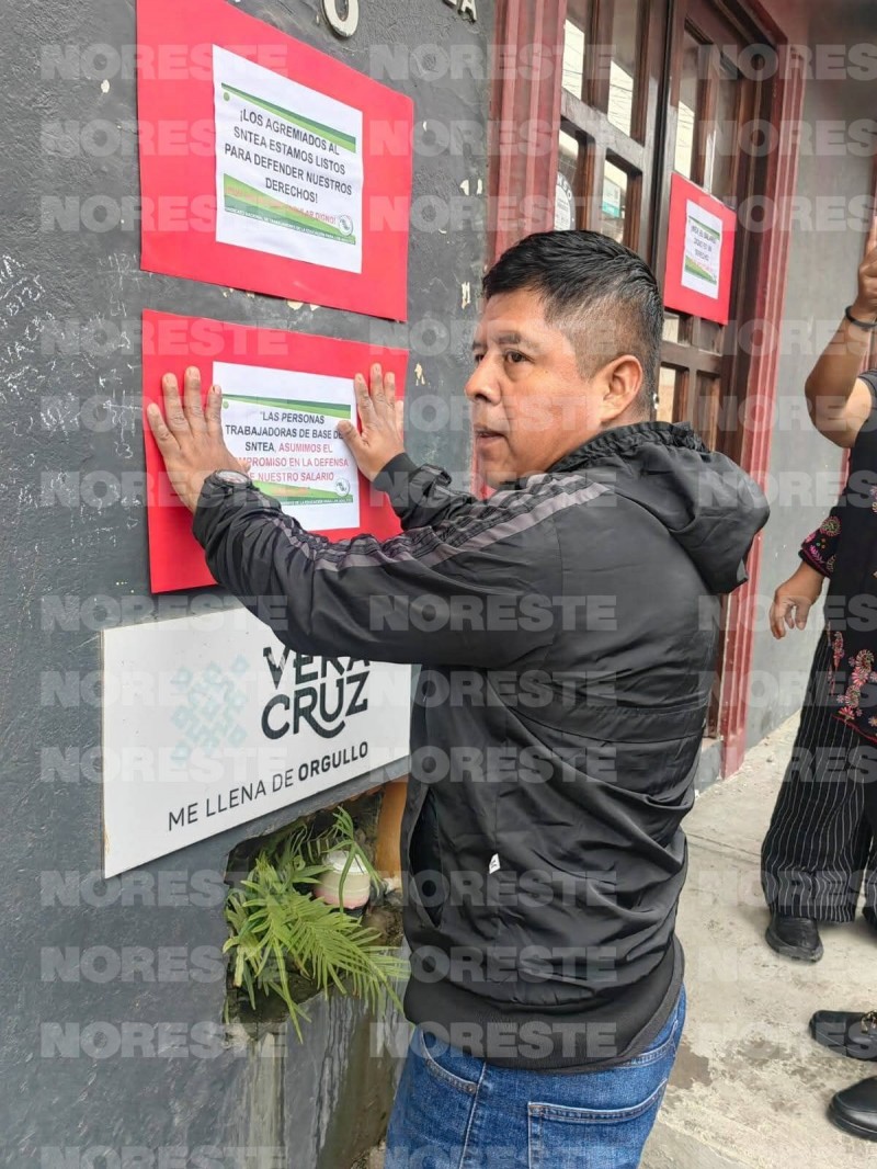 Integrantes de la Delegación 30 Veracruz del Sindicato Nacional de Trabajadores de la Educación para los Adultos (SNTEA) colocaron consignas en las oficinas del organismo en distintos puntos de la entidad, como medida de presión ante la falta de respuesta a sus demandas.