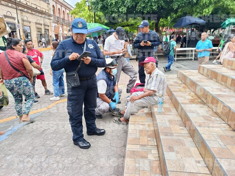 El adulto mayor, reconocido por su labor y presencia durante años en las calles de Papantla, se desvaneció presuntamente a causa de alteraciones en sus niveles de azúcar y presión arterial, lo que alertó a transeúntes que de inmediato solicitaron apoyo.