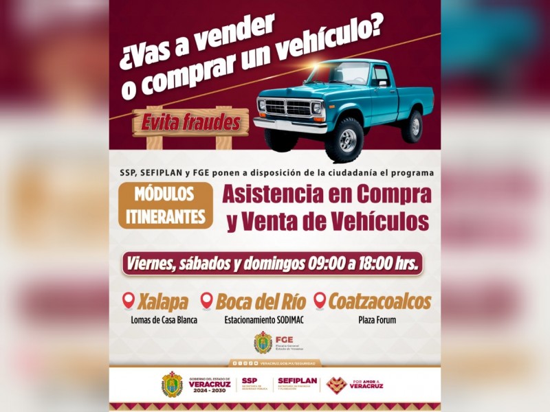 Con el propósito de fortalecer la seguridad patrimonial de la ciudadanía y prevenir el robo y/o fraude en la compra-venta de vehículos, el Gobierno del Estado, a través de las Secretarías de Seguridad Pública y Finanzas y Planeación, en coordinación con la Fiscalía General del Estado, implementará un programa que consta de módulos itinerantes de asesoría y verificación vehicular.