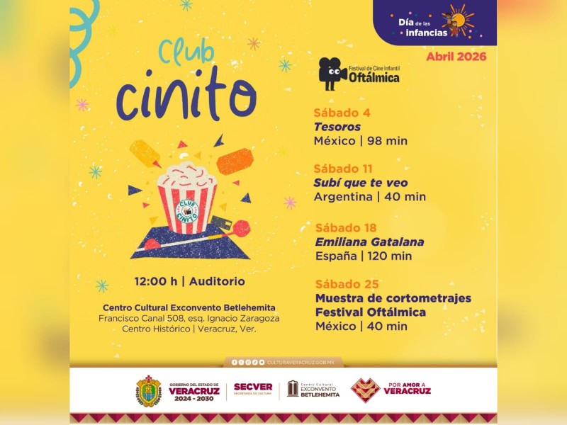 La Secretaría de Cultura de Veracruz (SECVER), en colaboración con el Festival de Cine Infantil Oftálmica, invita a disfrutar del programa cinematográfico Club Cinito, que se realizará los sábados de abril en el Centro Cultural Exconvento Betlehemita, en Veracruz, en el marco del Día de las Infancias.