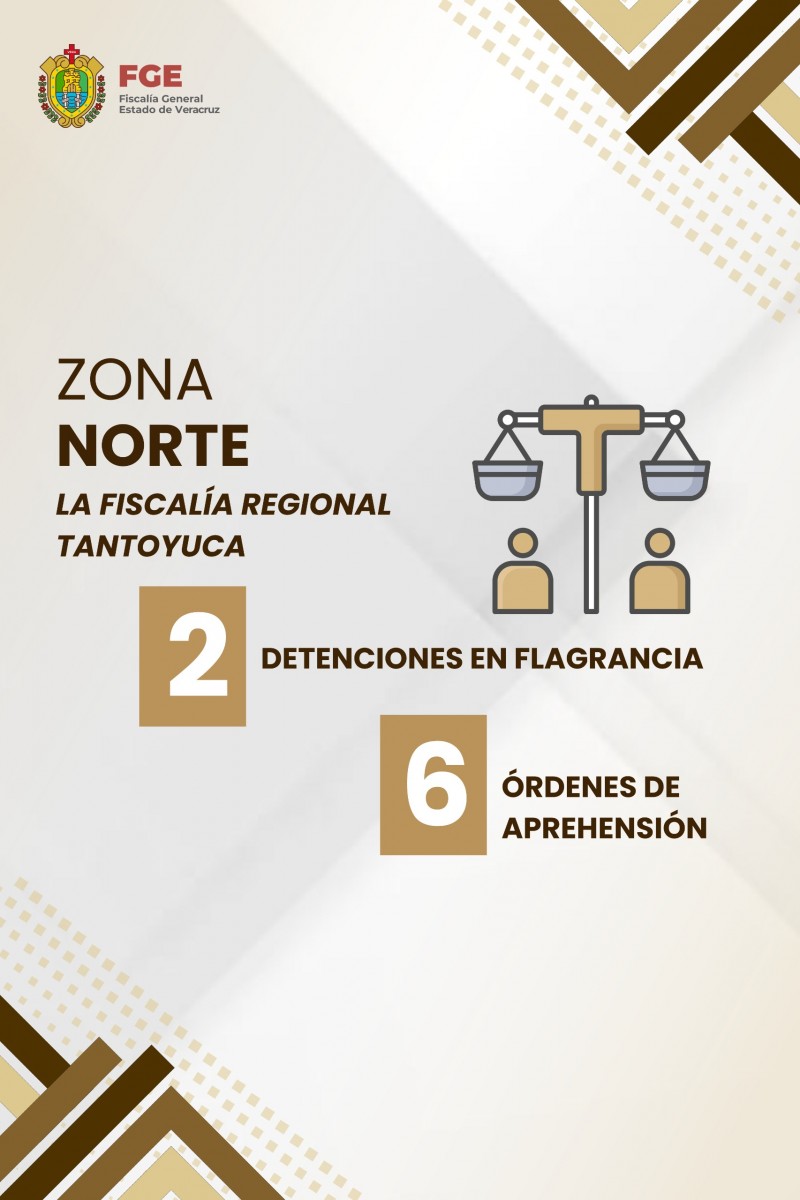 Dentro de la zona norte, se reportaron 2 detenciones en flagrancia y el cumplimiento de 6 órdenes de aprehensión por parte de la Fiscalía Regional Tantoyuca; mientras que la Fiscalía Regional Tuxpan llevó a cabo 7 detenciones en flagrancia y ejecutó 15 órdenes de aprehensión.