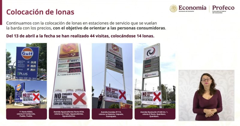 Como parte del protocolo de verificación, la Profeco ha implementado la colocación de lonas informativas en las estaciones que no cumplen con los estándares de precios establecidos o donde se detectan discrepancias en la información reportada.