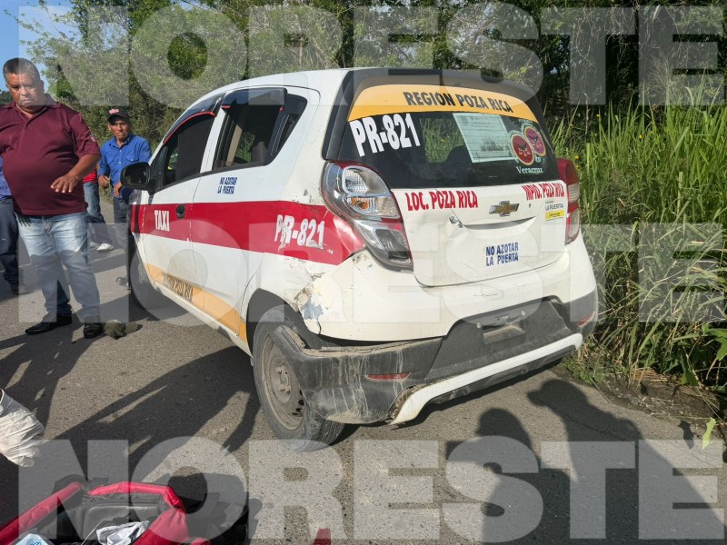 De acuerdo con los primeros informes, el conductor de la motocicleta, quien presuntamente se desempeña como repartidor de un molino de masa y tortilla, se estrelló contra un vehículo marca Chevrolet en modalidad taxi, identificado con el número económico 821 de Poza Rica, Veracruz, el cual se dirigía hacia la comunidad de Santa Águeda.