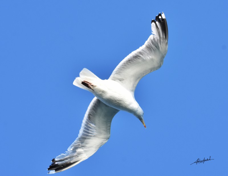 Gaviota sombría. Con una longitud de hasta 45 cm y un peso promedio de 825 g. Los adultos tienen alas negras o color gris oscuro, el resto de color blanco, pico amarillo, con una mancha roja. Tardan hasta 4 años en alcanzar la madurez.
