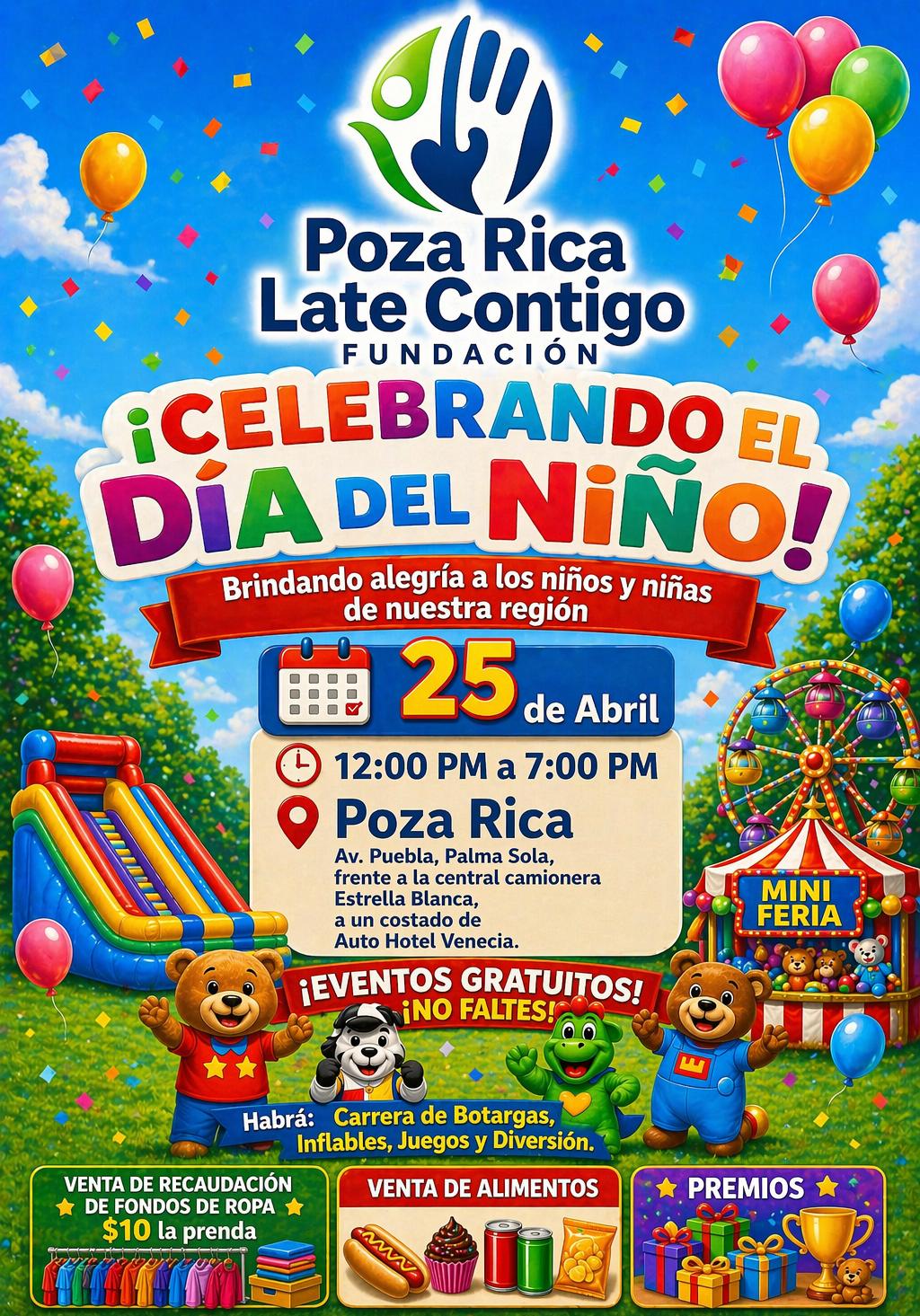Con una jornada llena de juegos, convivencia y sorpresas, la Fundación Poza Rica Late Contigo, encabezada por Arturo Zavala, llevará a cabo el evento “Celebrando el Día del Niño” este sábado 25 de abril, con el objetivo de regalar experiencias memorables a niñas y niños de la región.